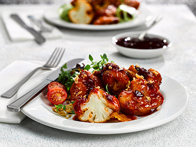 - Place the remainder of the sauce into a dip pots and arrange the glazed cauliflower on your chosen plate.
