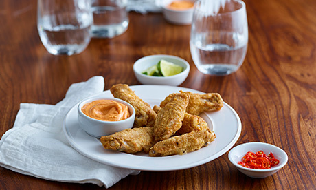 - Once cooked, season the wings as soon as they come out the fryer and plate with a pot of the sauce and optional finely chopped red chilli and a lime wedge.