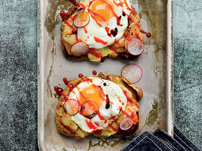 - Meanwhile fry the eggs. Once the cheese has glazed, top with the egg, sriracha sauce, radish and a drizzle of soy sauce.