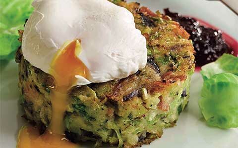 - Serve the sprout and gammon potato cake with the poached egg on top.