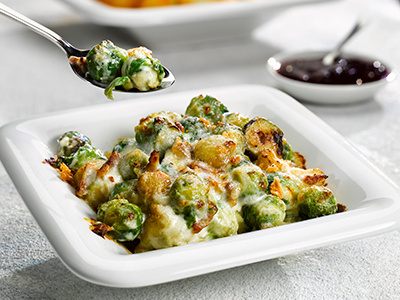 - Place the sprouts into an oven tray and cover with béchamel sauce and grated Gruyère cheese.