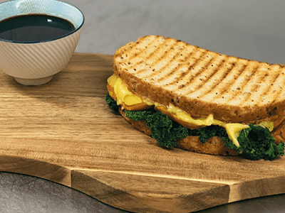 - Butter one of the bloomer slices and layer the kale, squash and potato slices and the cheese, placing the unbuttered bloomer slice on top.