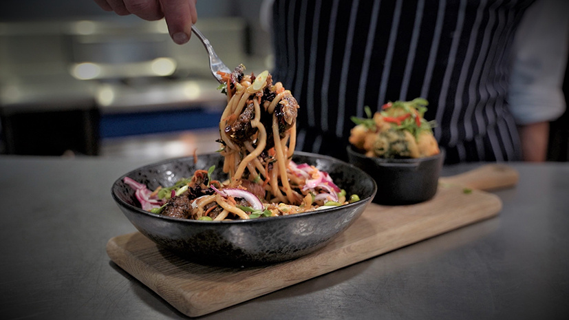 - Garnish the noodles with the edamame beans, pickled onions and micro coriander, with the crispy battered vegetables on the side