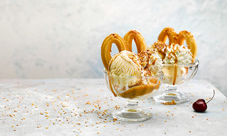 - Layer the ice creams against the cooked churros in you chosen container and brush the top of the churros with toffee sauce