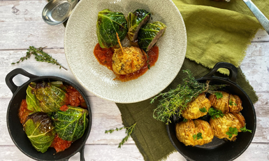 6. Roll the mince mixture into balls, to the size you desire, and wrap them in cabbage before placing them bottom side down in a baking tray.