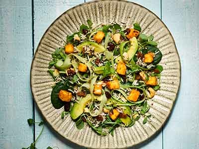 - To assemble the salad - tumble the mixed salad through the grain mix , top with the toasted cashew nuts, polenta croutons and avocado slices and finish with fresh herbs and an extra drizzle of dressing.