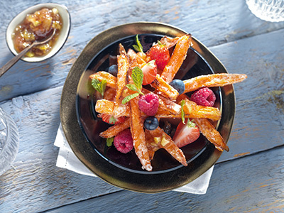 - Place the freshly cooked sweet potato fries into a serving dish, sprinkle with icing sugar and gently flambé until you have a very thin crust, similar to a crème brûlée.