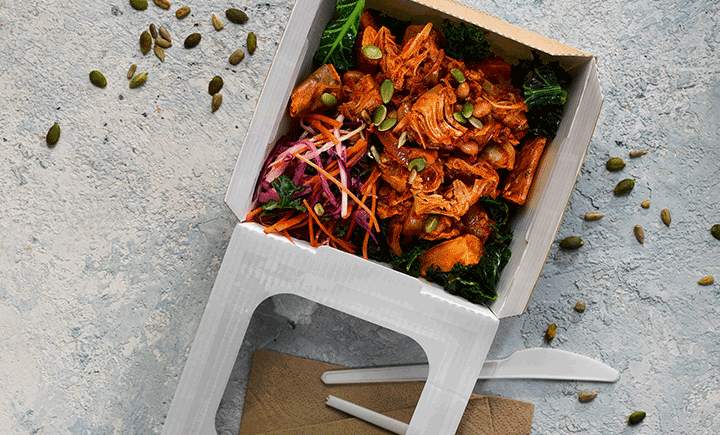 - Crush the sweet potato and add the kale dress with 10ml olive oil and lime juice then place equally into your hot box packaging. Top with the jackfruit tinga and place into the oven until hot.