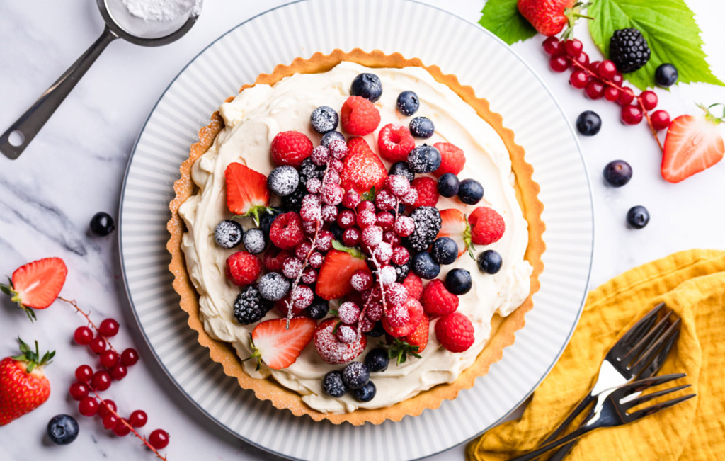 - Top the tart with mixed berries and dust with some icing sugar. Slice and serve.