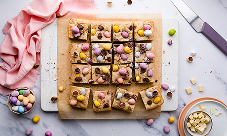 - In a small jug, whisk together the eggs, salt, and vanilla. Add the mixture into the melted butter and sugars and mix to combine. Add the flour and white chocolate and fold until combined. Pour the mixture into the baking tin and bake for 20 minutes. After 20 minutes in the oven, you can remove the blondie and add some chocolate mini eggs on top. Press them gently into the top of the bake. Return the blondie into the oven for a further 15-18 minutes, or until the top is golden, and the toothpick inserted in the middle comes with some crumbs still attached to it.