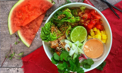 - Arrange the rice and quinoa into a serving bowl, top with the ingredients and finish off by sprinkling over the sesame seeds and crispy onions.
