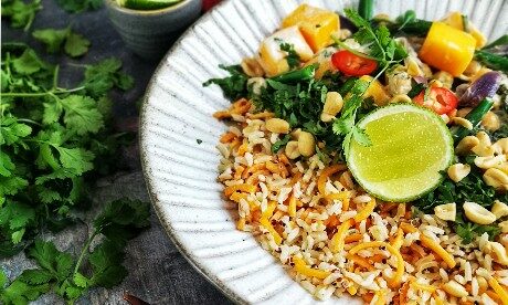 - Add the blanched vegetables, coconut cream and vegetable stock. Bring to a simmer and cook for 4-5 minutes