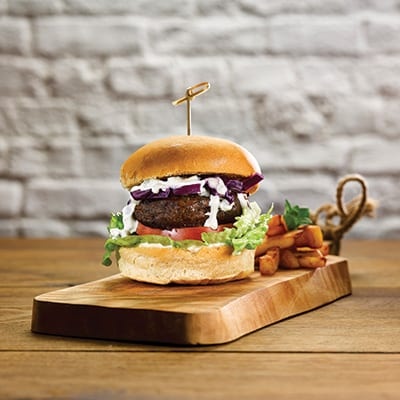 - Chargrill the lamb burger allowing the fat to drip away until the centre reaches 75oC, allow to rest, season the burger after cooking.