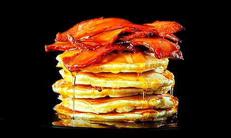 - To assemble the pancakes, remove them from the oven and create a stack, top with the crispy bacon, a knob of vegan spread and a drizzle of agave or vegan maple syrup.