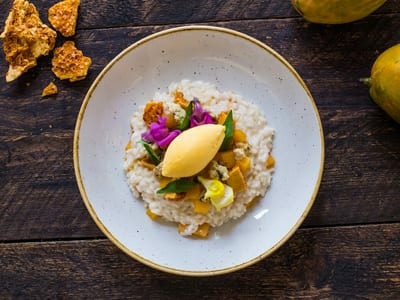 - Place the diced mango in the bottom of a bowl, top with the rice pudding and then finish with the honeycomb, crumble, sorbet and herbs