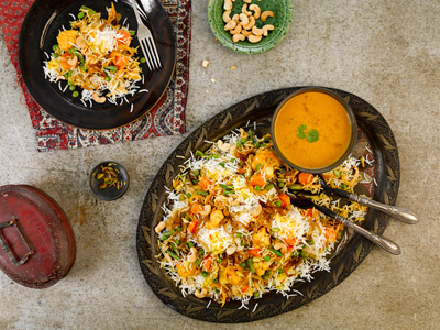 - Take an ovenproof pot which will snugly accommodate the rice and veg curry, such as a casserole dish. Remove half of the veg from the veg curry using a slotted spoon (to leave the sauce behind) and place it at the bottom of the pot. Add a little of chopped mint and coriander at each layer. Top the veg with half of the rice and half of the onions and repeat with the rest of the veg, rice and onions. Keep the sauce of the curry aside to serve with the biryani. Bake the biryani for 20 mins.