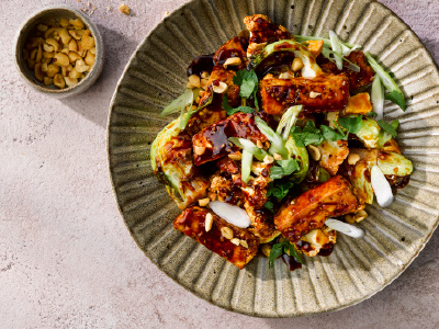 - Heat a large frying pan and add the sesame oil - Add the cauliflower and cook for a couple of minutes until seared then turn and add the sliced tofu and cook for 1 minute.
