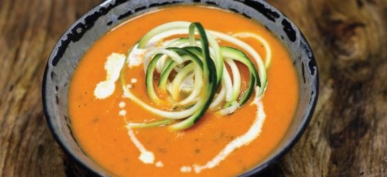 - Once soup is correct consistency, blitz using a blender then add the lentils, courgettes and cheddar and fold through.