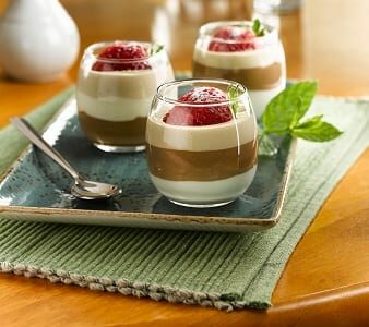 - Once all folded through place the mixes into three separate piping bags and pipe into glasses layering the three mousses up.