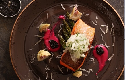 - Dress the plate with a small amount of the beetroot mix, artichokes, asparagus and trout, garnish with the drained fennel and garlic. Top with optional caviar, a small squeeze of lime, olive oil and a sprinkle of salt