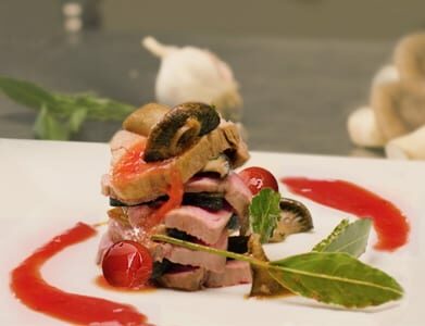 - Serve the thinly sliced fillet, alternate with mushrooms by composing a tower of from the bread slices, garnish with the deglazed sauce cooking liquid and serve.