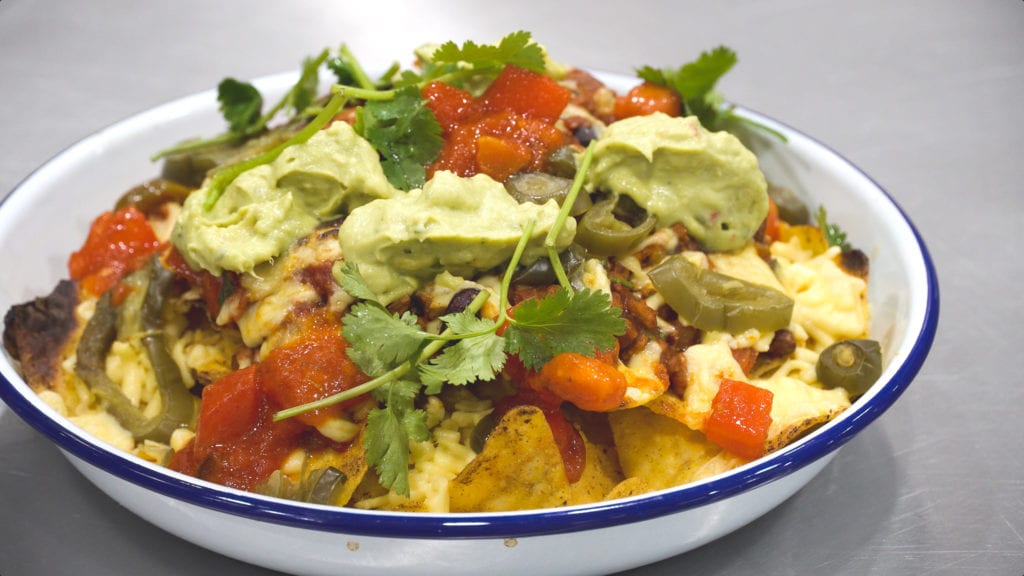- To prepare the nachos, place the tortilla chips into an ovenproof bowl