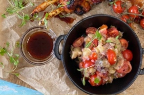 - Add the expresso shot, chopped chargrilled red pepper and finish with chopped coriander - store until needed