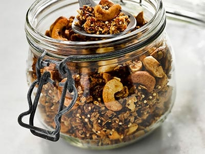 - Mix oats, cashew nuts, chopped almonds, sugar, salt and quinoa.