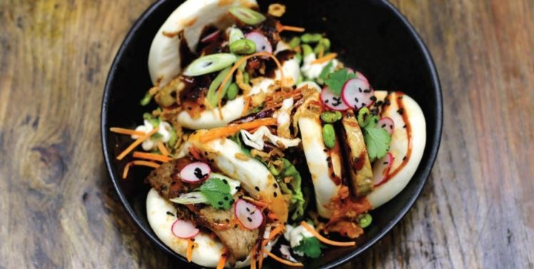 - Top with the cucumber and radish mix, finely sliced red chilli, sliced spring onions, and drizzle with garlic mayo.