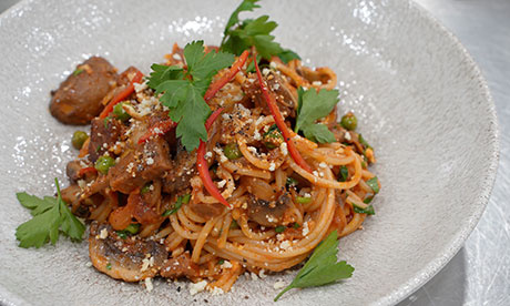 - Add the remainder of the oil to the frying pan and cook diced onions, garlic, mushrooms and then add the sauce.