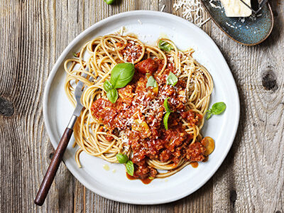 - Serve the Spaghetti Bolognese topped with the cheese and basil.