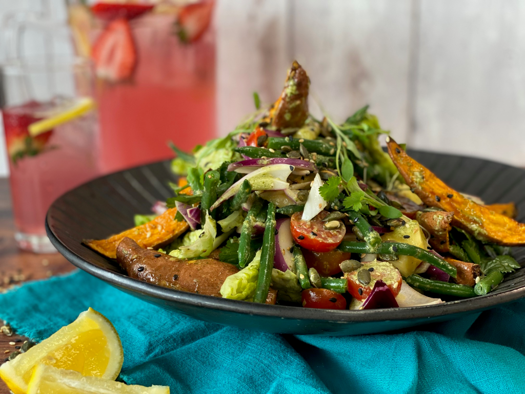 - Place the sweet potato wedges into a mixing bowl. Add the blanched greens, the tomatoes (after cutting them into halves), fine wedges of red onion, sliced little gem lettuce and wedges of chargrilled pineapple. Set to one side.
