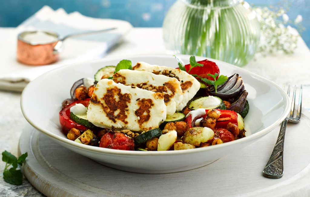 - Pan fry the halloumi, plate up the veg mix, top with halloumi, drizzle over yoghurt, top with chopped parsley, torn mint and seeds.