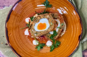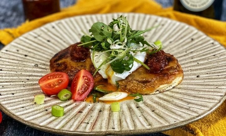 - Serve with a poached egg, a little more chutney, sliced spring onions and a fresh rocket salad. Finally, drizzle with oil if you wish