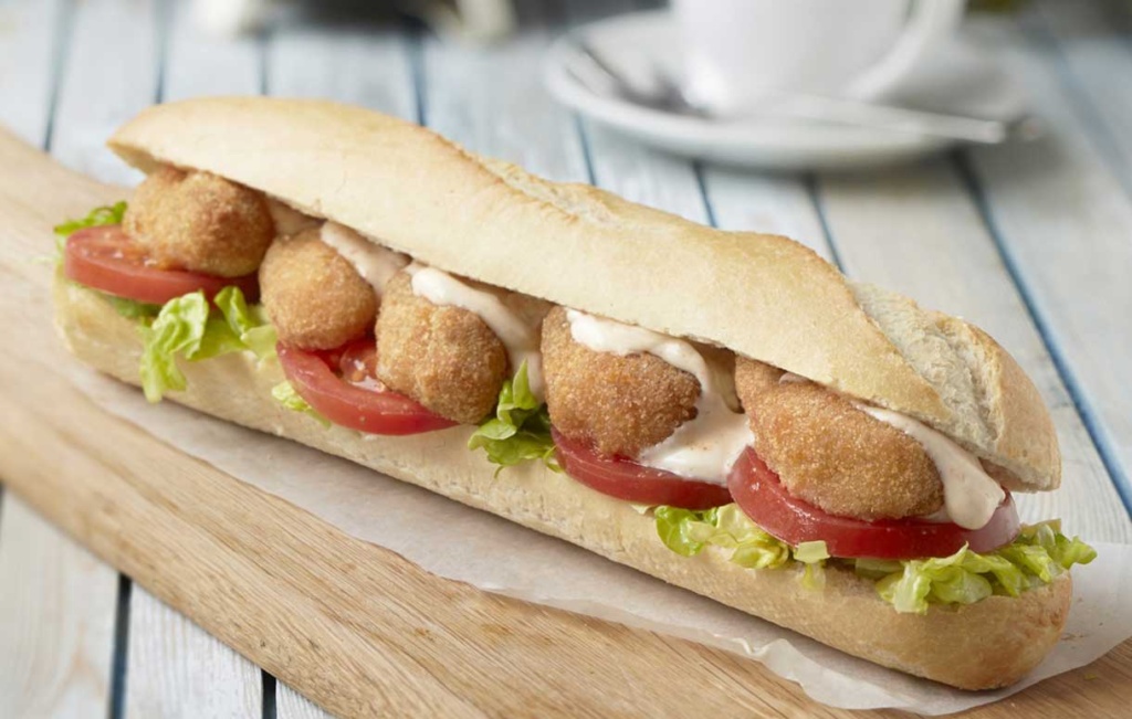 - To assemble the Po’boys, divide the lettuce between the four baguettes, add a layer of sliced tomatoes and cucumber then arrange the scampi on top.