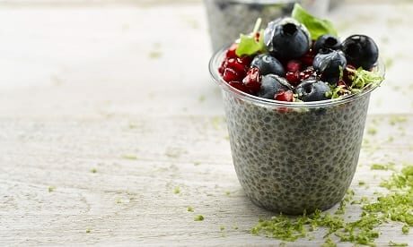 - To serve, spoon the chia seed mix into glass pots (or take-out pots as pictured) and top with the blueberries, pomegranate seeds, drizzle of honey and micro basil, finish with a grate of lime zest