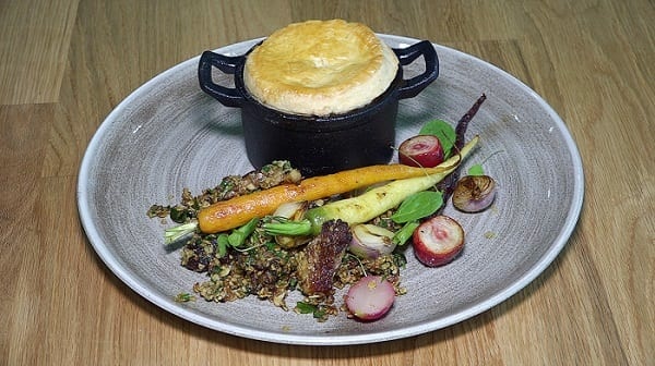 - Now add the vegetables, bacon, garlic, thyme and butter and stir to prevent it sticking and burning (add a little ale if it starts to stick).