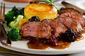 - Arrange the vegetables on a plate then slice the venison into nice medallions, place carefully on the vegetables then spoon the sauce around the plate (be generous)