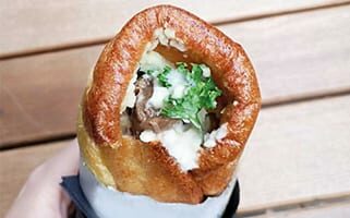 - To assemble, lay the Yorkshire pudding on a board and fill with 100g of the roasted vegetable mix, 20g blanched greens,120g meat and sauce, drizzle with 20g of horseradish sauce and then fold the ends in and roll tight