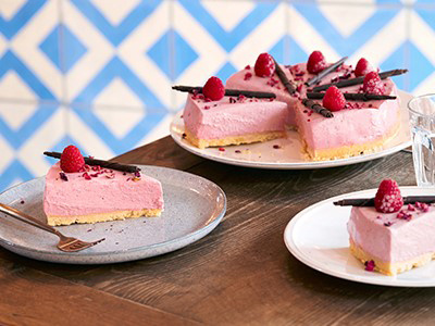 - Cut the cheesecake into 8 wedges and garnish each serving with 2-3 frozen raspberries, 1 tsp freeze dried raspberries, 1-2 tbsps sprinkling of dried rose petals, and Callebaut® dark chocolate pencils.