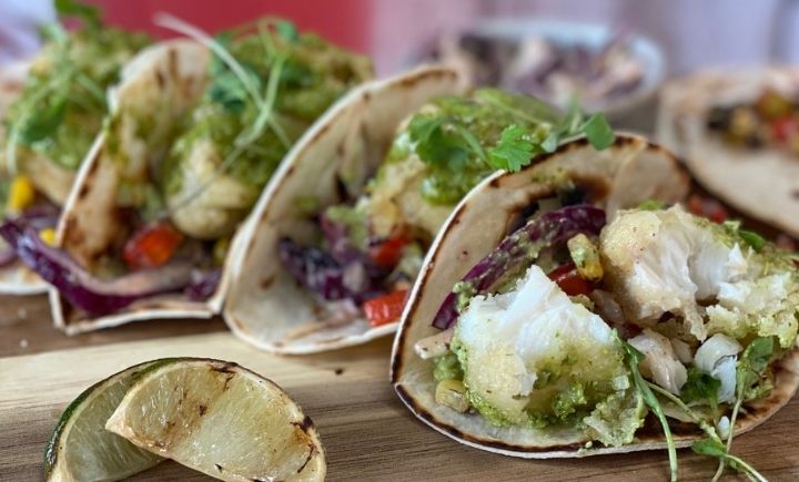 Baja fish tacos with punchy Peruvian flavours - served with green aji dressing, pickled slaw, coriander and fresh lime.