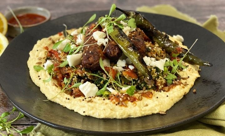 Vegan kofta kebabs, crumbled vegan cheese, semi-dried tomatoes and mixed grain salad on a bed of thick harissa hummus.