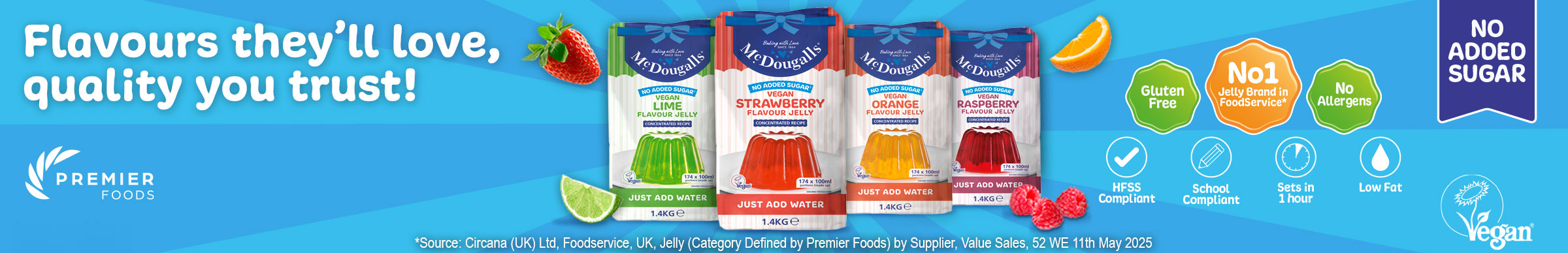 Developed with caterers in mind, our new McDougall’s jelly range is non-HFSS and is also vegan, gluten-free and free from all major allergens, making it suitable for a wide variety of dietary requirements.