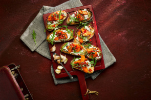 A creamy burrata bruschetta finished with roasted squash, chilli and olive oil.