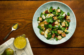 A delicious winter salad with crisp pear and Stilton cheese, finished with toasted walnuts and pecans in a zesty lemon
