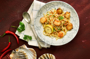 Seared scallops with parsley and lemon linguini.