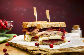 A deliciously layered toastie, with turkey, brie, truffle oil, béchamel and cranberry sauce.