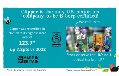 In 2018 Clipper transitioned to tea bags that are unbleached, plant-based, non-GM and fully biodegradable (sealed with a PLA bio-material rather than fossil-fuel plastics). More recently they invested over £1 million to redesign their larger packs to be fully recyclable, eliminating inner foil bags and switching to materials suitable for kerbside recycling.