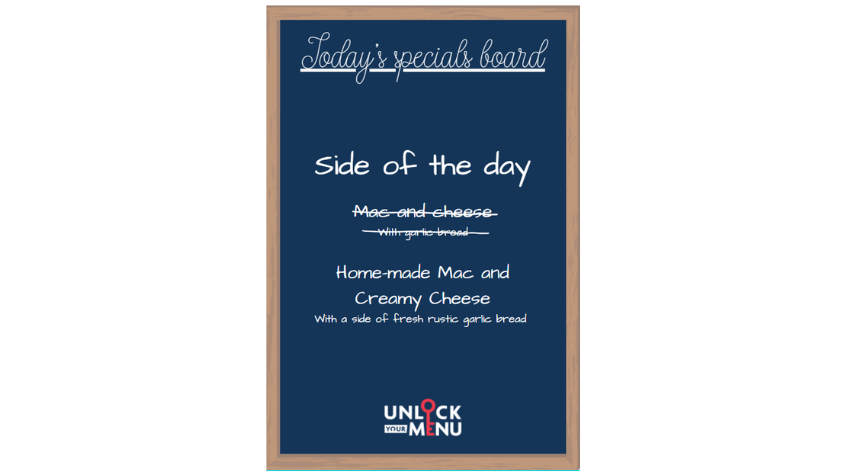 How you describe the dish on your menu does half the job for you. Say things like “with fresh rustic garlic sourdough” which really makes a dish sound quality, but the reality is that it’s just adding a cost effective garlic bread to the side of the dish. Easy win!