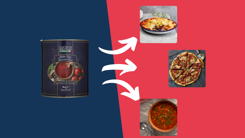 • Look at the sauces you’re using and find ways for using them across your menu on different dishes. For example, you could use a tomato base in pasta dishes, soups and as a pizza topping, but you could also use it to mix it in with other premium flavours, like harissa, for quality dips.